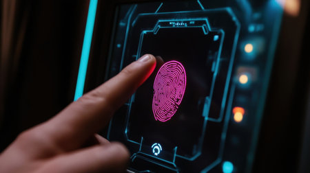 A close-up view of a high-tech fingerprint scanner displaying a vibrant fingerprint pattern. A user's finger interacts with the digital interface, emphasizing security technology.