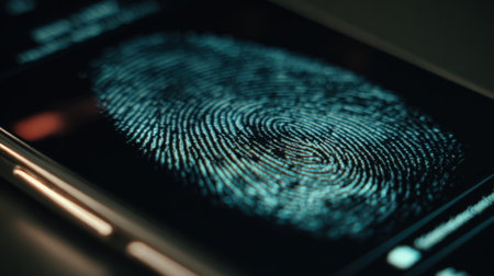 A close-up of a high-tech mobile device showcasing a detailed fingerprint scan interface, set in a futuristic environment emphasizing innovation and digital security.