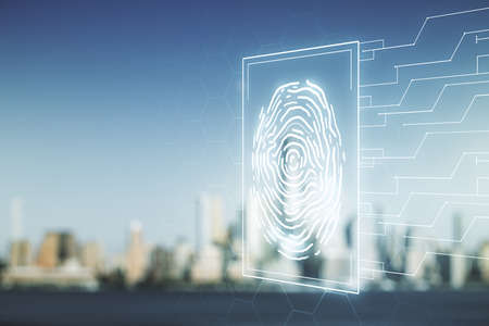 Multi exposure of virtual creative fingerprint hologram on blurry cityscape background, personal biometric data concept