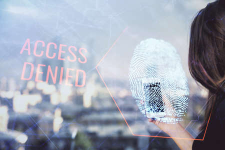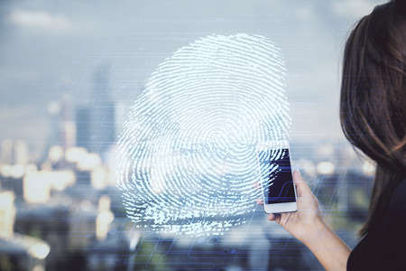Double exposure of fingerprint hologram and woman holding and using a mobile device. Security concept.