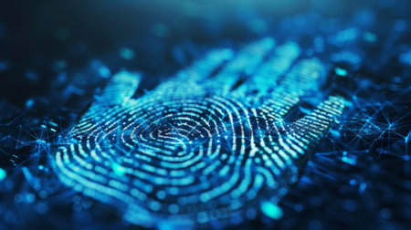 A close-up view of a digital fingerprint, highlighted by a blue glow, showcases intricate patterns while the background remains dark and subtle.