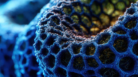 Macro photography reveals the detailed texture and hexagonal cells of a blue coral.