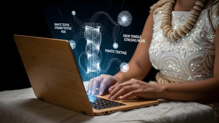 Close-up of hands on a laptop keyboard with a glowing blue holographic data visualization and...