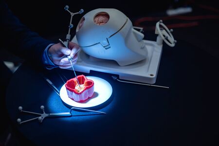 Medical students learn about brain surgery tools