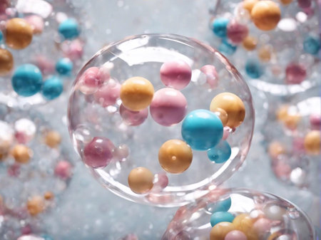 Abstract 3D Render of a Colorful Chain of Bubbles and Spheres Floating in a Liquid Substance