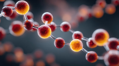 Abstract illustration of a molecular structure with vibrant red and orange spheres connected by thin lines against a dark blurred background