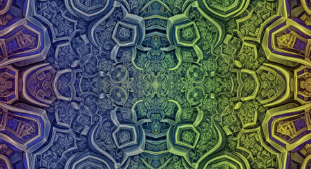 A detailed and symmetrical psychedelic pattern resembling a fractal or kaleidoscope, with a vibrant color gradient from blue to green and yellow. This intricate and mesmerizing image works as an abstract background for themes of digital art, spirituality, or complexity.