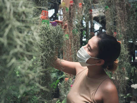 Beautiful Asian woman wearing white clean medical face mask and beige sleeveless shirt and looking at hanging upside down plant in the green garden. Happy and love with nature, new normal concept.