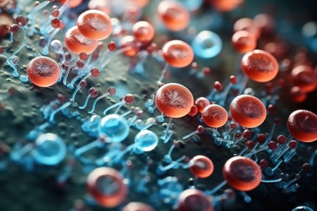 Cellular dance in red and blue hues. Vivid cellular interplay under the microscope.