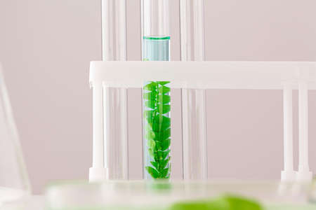Natural drug research, Plant extraction in scientific glassware, Alternative green herb medicine, Natural organic skincare beauty products, Laboratory and development concept.