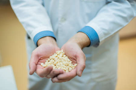 Plastic granules of polycarbonate in hand - extrusion manufactory