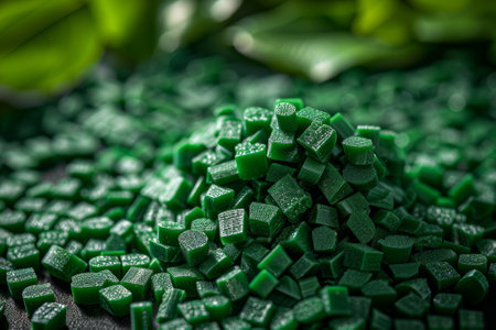 Stack of green recycled plastic pellets showcasing eco sustainability. AI generated.