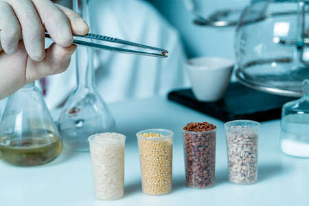 Healthy food concept. An assistant holds a grain with tweezers in a laboratory for food quality control of grain crops. Various varieties of cereals in a food laboratory.