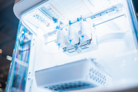 In a modern laboratory, a scientist carefully monitors an advanced 3D printer producing a detailed bioprinted structure.