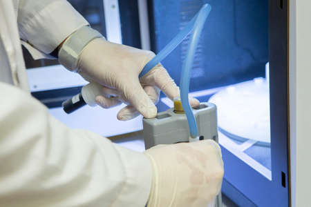 Close-up of scientist in protective gloves using special equipment in his work in the laboratory
