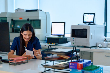 Scientist reviews data and smiles while working in a modern laboratory during the afternoon