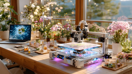 A person crafting a product using a 3D printer in a well-lit workspace. Perfect for maker culture, design, and modern craftsmanship visuals.