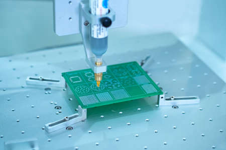 Microchip PCB creation. Microprocessor manufacturing process. Process of drawing pattern onto printed circuit board. Applying printed pattern to PCB for mounting parts according to scheme.