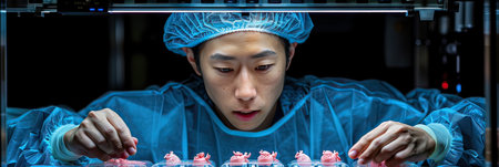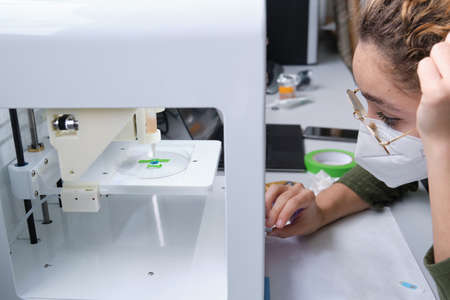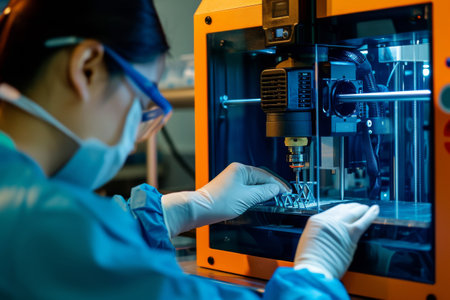 Researcher adjusting a 3D bioprinter to 3D print cells onto an electrode. Biomaterials, tissue engineering concepts.