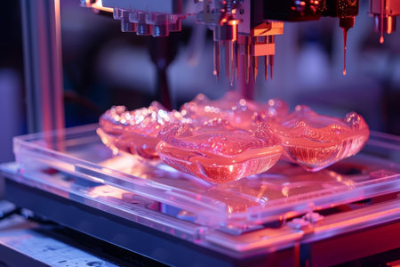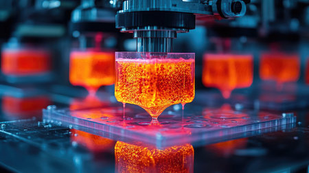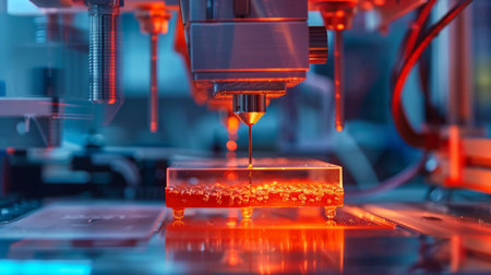 Captivating view of advanced 3D printing technology, featuring vibrant lighting and close-up details of the printing process. Ideal for tech and innovation themes.