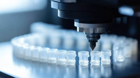 Close-up view of a high-tech instrument analyzing small transparent vials in a sophisticated laboratory setting, showcasing precision and innovation in research.