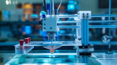 Modern laboratory showcasing a 3D printer in action, surrounded by beakers, test tubes, and a digital screen.