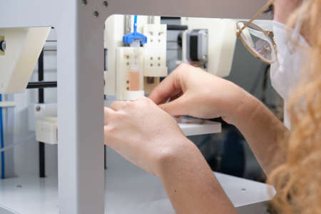 Researcher getting 3D bioprinter ready to 3D print cells onto an electrode. Biomaterials, tissue engineering concepts.