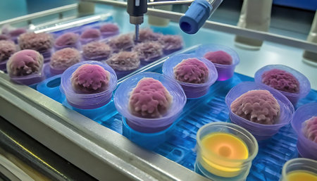 Closeup of a robotic arm precisely manipulating a Petri dish filled with genetically engineered cells with intricate machinery in the background highlighting automation in the lab..