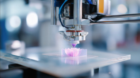 3D printer creating a detailed floral design in a high-tech laboratory environment during daytime