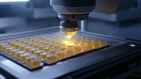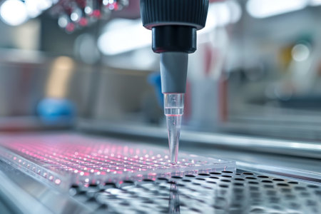Automated pipette system in a high-tech laboratory setting, designed for precision in medical research, specimen analysis, and laboratory trials. Showcasing scientific innovation in action.