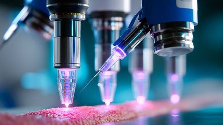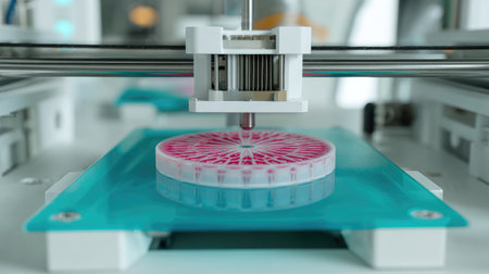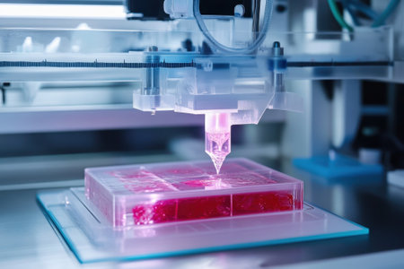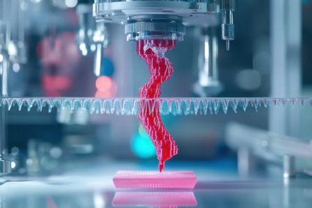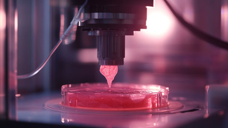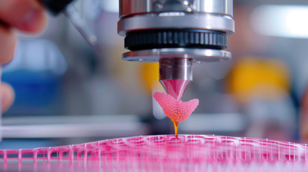 A close-up view of a high-tech 3D bioprinting process in a laboratory, showcasing pink bio-material being printed for advanced tissue engineering applications.