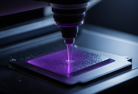 Liquid is precisely applied onto a metal surface by a high-tech machine, showing an advanced manufacturing process in a dimly lit workshop.