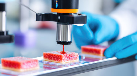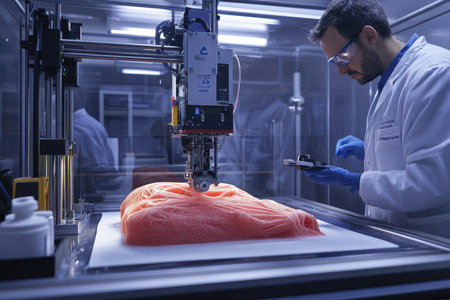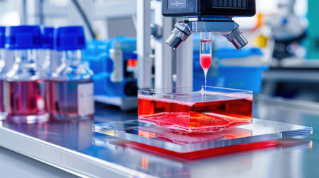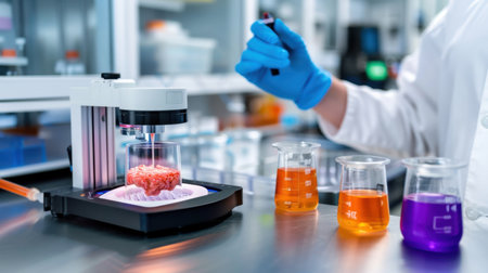 Advanced equipment is producing a realistic meat alternative using 3D printing techniques in a lab.
