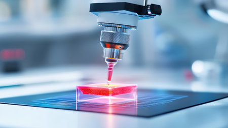 This image captures the advanced precision laser cutting technology in a laboratory setting, emphasizing the intricate process of sample preparation and analysis.