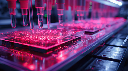 This image showcases an automated pipetting system used for precise liquid handling in a modern biotechnology laboratory, under a vibrant red light.