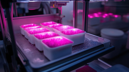 Innovative indoor hydroponic system features vibrant LED lights, enhancing the growth of various plants in precision-controlled environments for sustainable agriculture.