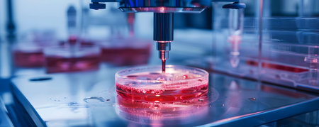 3D bioprinter extruding material, building a complex biological structure under red light in a cutting edge laboratory