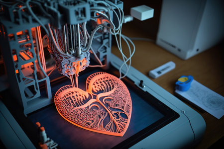 A close-up view of a 3D printer creating an artificial heart model, featuring intricate details and vibrant colors, showcasing advancements in medical technology.