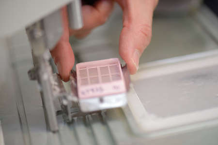 Close up crop view of scientist hands putting microscope glasses in special store box.