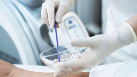 A health worker in blue gloves holds in hands a device for biopsy. High quality photo