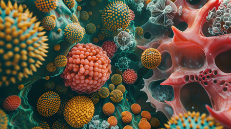 This vivid view showcases various viruses and bacteria, emphasizing their intricate structures and vibrant colors under a microscope, enhancing scientific discovery and understanding.