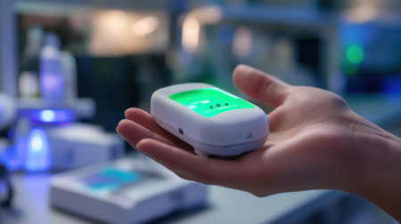 Biosensor Technology A medium closeup image highlighting an advanced biosensor device being held in a researchers hand showcasing its compact design and the glowing interface that indicate