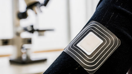 A closeup of a wearable patch adhered to skin showcasing its elegant design and tiny sensors with a softfocus background of laboratory equipment indicating advanced bioengineering..