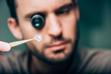 Selective focus of watchmaker holding watch part with tweezers, panoramic shot