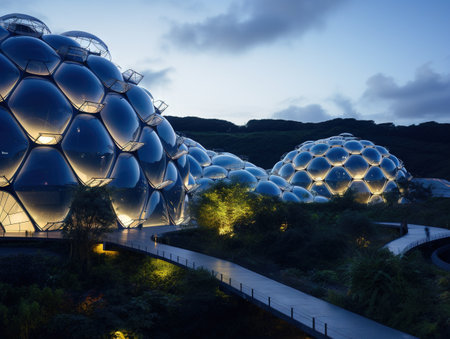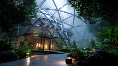Geodesic dome glass forest night mist lights architecture eco futuristic hillside sanctuary glows softly amid pine trees and fog