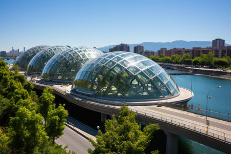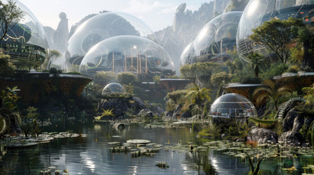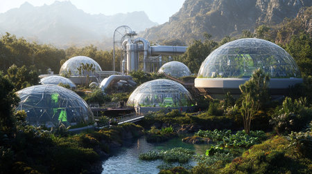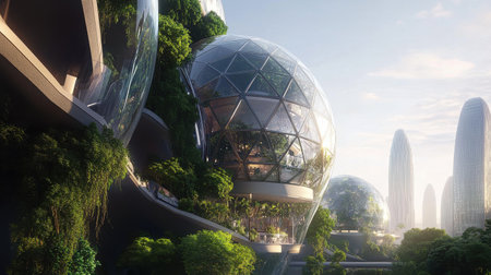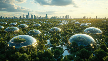 Futuristic cities under transparent domes harmonizing with surrounding tech