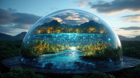 Transparent dome with glowing energy nodes protects vibrant forests, oceans, and mountains, symbolizing harmony between technology and nature for biosphere sustainability