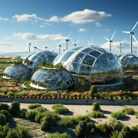 This stunning image depicts a modern greenhouse complex designed for sustainability, featuring innovative technologies such as solar panels and wind turbines in a scenic desert setting.