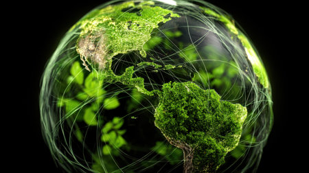 Vibrant globe showcasing lush greenery and interconnected lines symbolizes global sustainability and environmental awareness. This represents importance of preserving nature and fostering healthy