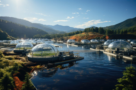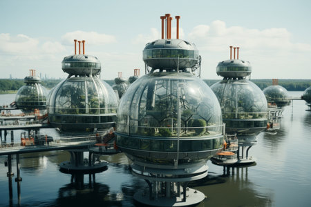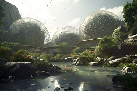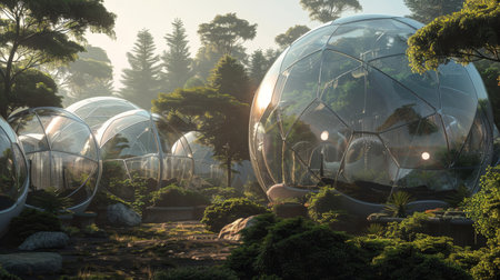 A collection of glass sphere buildings on water with trees growing inside. Futuristic architecture concept and eco-friendly living by the lake with reflections on the water.